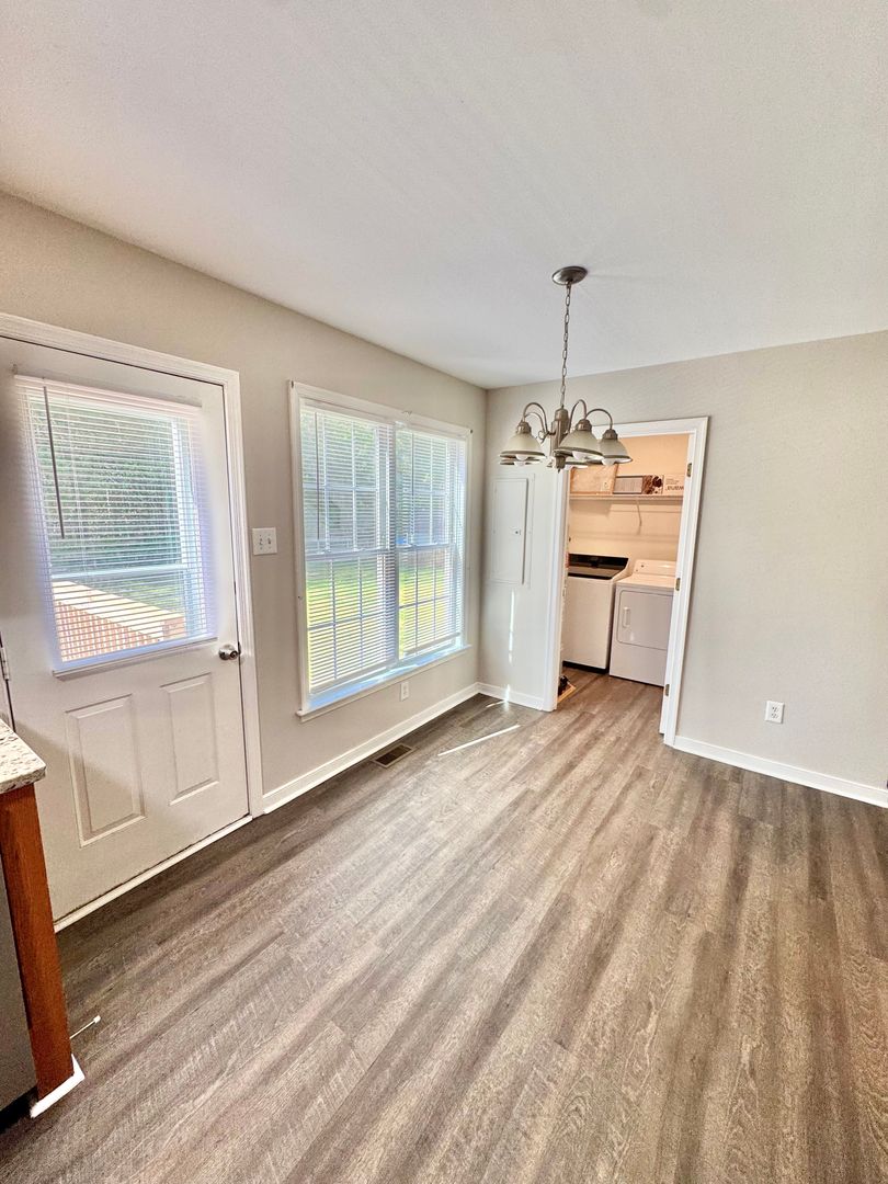 Enjoy new paint throughout, luxury vinyl plank flooring downstairs, and brand-new carpet upstairs. The home also features stylish updated light fixtures featured throughout much of the home, ceiling fans in every bedroom, and a newer washer and dryer for added convenience. The kitchen is equipped with stainless steel appliances, including a refrigerator, stove/oven, and dishwasher, as well as granite countertops.