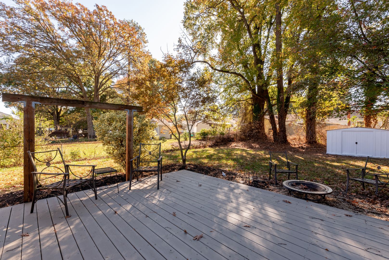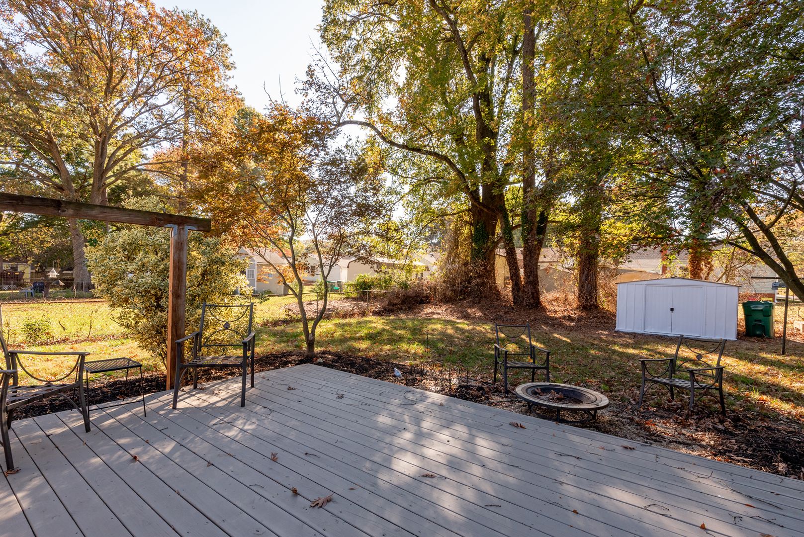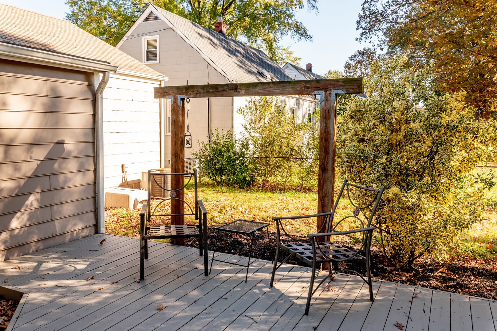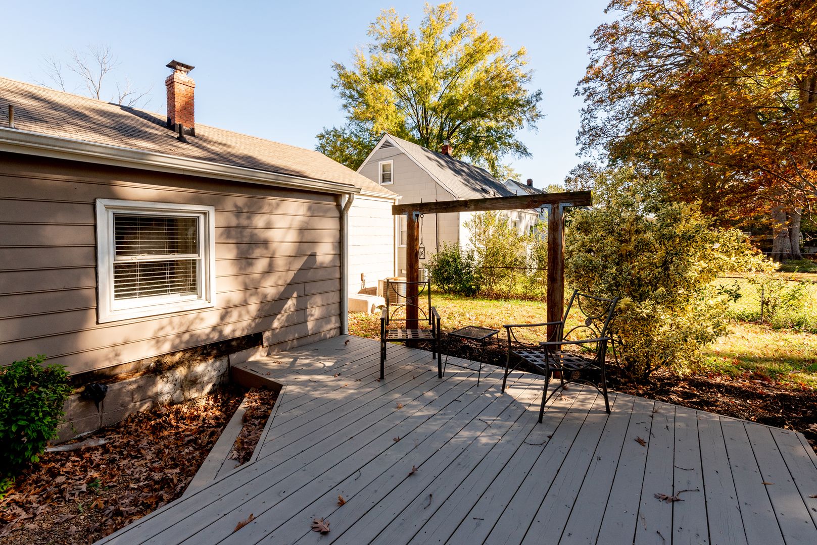 The front room and dining room showcase beautifully refinished hardwood floors, and window treatments are thoughtfully included throughout. The kitchen is well-appointed with a large island offering optional seating, a newer refrigerator, dishwasher, and range/oven. Pull-out shelving in many of the cabinets adds an extra touch of convenience for effortless storage. The outdoor area provides a peaceful retreat, perfect for unwinding after a busy day.