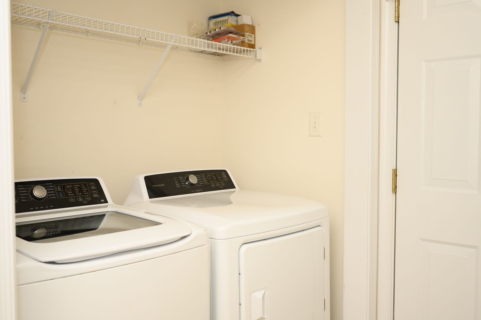 The eat-in kitchen is both functional and well-equipped with matching black appliances, including a stove/oven, dishwasher, microwave, and refrigerator. Ample cabinet space and a pantry provide plenty of room for storage, making it ideal for everyday meals or entertaining. The home also boasts a two-car garage with an automatic opener and a pedestrian door for easy access. A utility closet at the garage entrance offers additional storage, plus the laundry closet with full-sized washer & dryer, also conveniently located on the first floor.